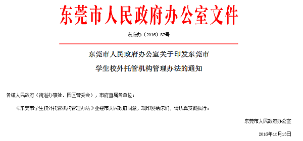 今年八月,东莞市政府正式出台《东莞市学生校外托管机构管理办法》。《管理办法》鼓励社会力量通过自行设立、合作设立等方式设立上规模的学生校外托管机构,并逐步成为学生校外托管机构的主要力量。《管理办法》对选址、服务场所规范、工作人员、人身安全保障,消防安全规范、食品安全规范、卫生安全规范、风险防范等做了多项严格要求,并由民政部门会同消防、食品药品监管、住建、教育等部门对学生校外托管机构进行年度检查。